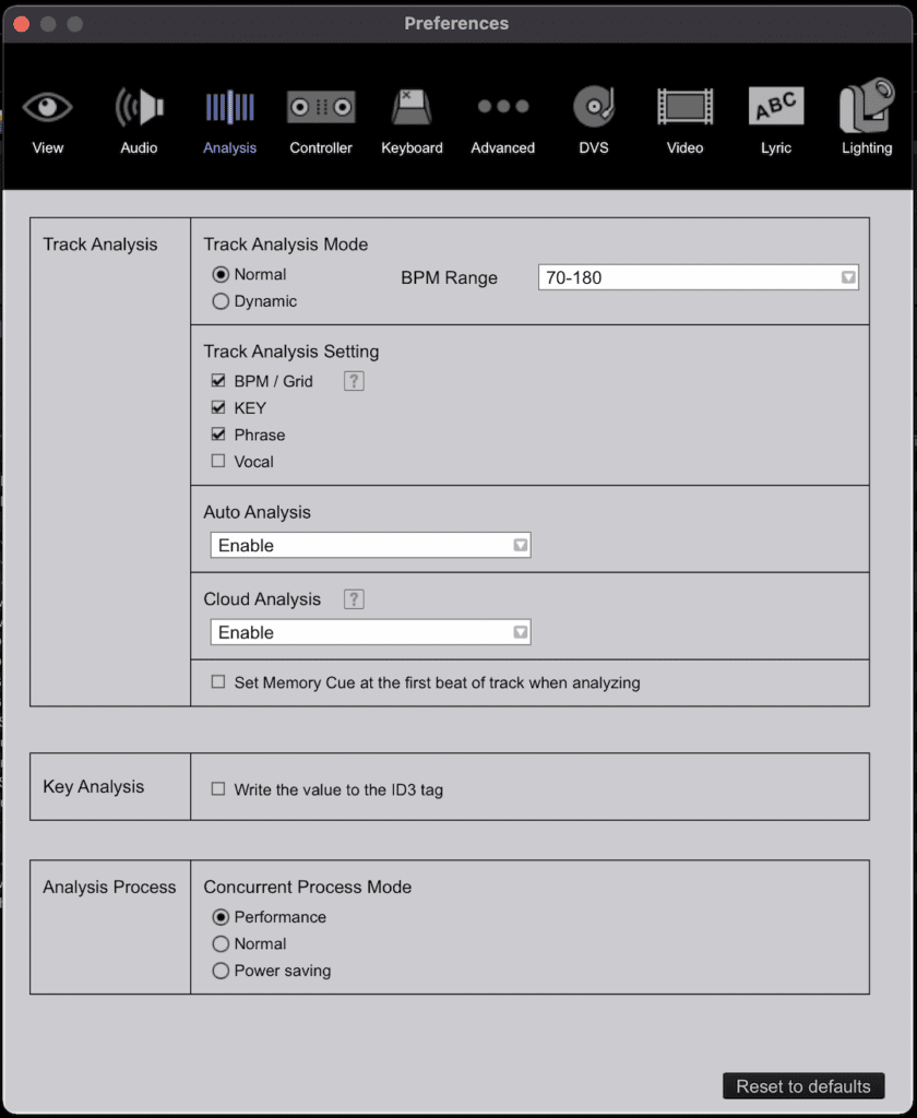 Los datos de BPM y retícula son esenciales para una mezcla fluida de las pistas y una aplicación precisa de los efectos. Para configurar los preajustes de análisis, ve a la pestaña «Análisis» y selecciona «Normal» en «Modo de análisis de canciones». Esta opción es la mejor para música con un patrón de tempo constante, ya que es más eficaz que el modo «Dinámico», que se utiliza para música con un tempo fluctuante.