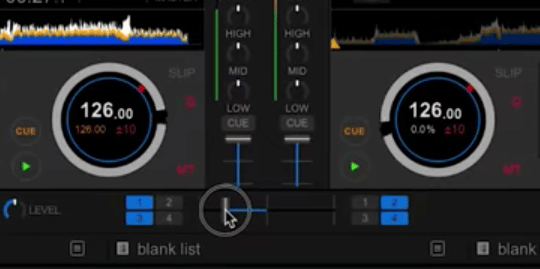 Un mezclador en software o hardware de DJ consta de dos upfaders, que se utilizan para aumentar o disminuir de forma controlable el volumen de cada pista, y un crossfader debajo de ellos.
