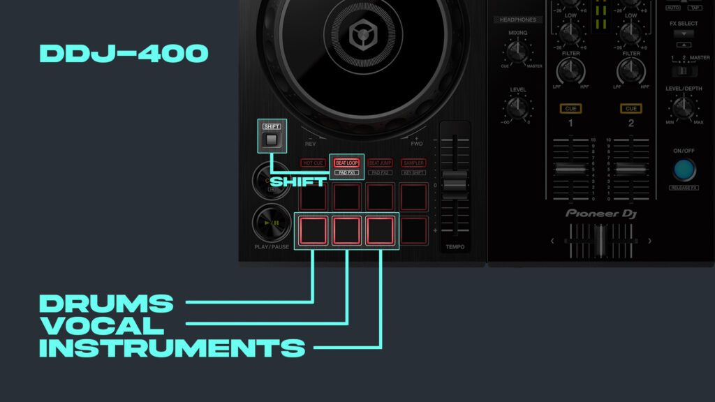 Nota* Pad FX1 es una función shift en el DDJ-400. Se accede a ella manteniendo pulsado shift y pulsando el modo pad de beat loop. Se accede a ella manteniendo pulsado shift y pulsando el modo beat loop pad. En todos los demás controladores, pulse el modo Pad FX1.