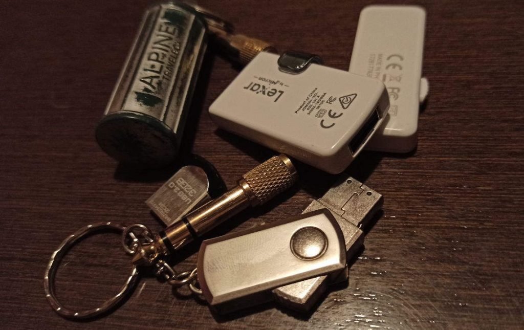 Para uno de mis USBs (foto arriba), he añadido mis propias pegatinas y un silbato de metal, lo que hace que sea muy fácil distinguirlos.
