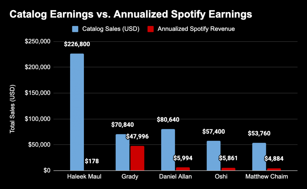 A continuación puedes ver a los artistas que más venden en Catalog y su comparación con los ingresos estimados en Spotify, basados en los 3.700 dólares por millón de streams (o 0,0037 dólares por stream).